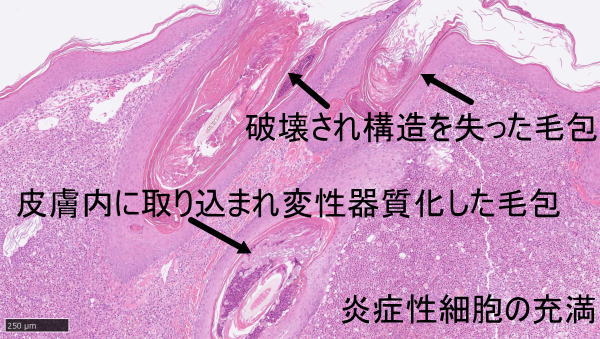 皮下組織に充満する炎症性細胞が認められる。毛包は全て破壊され、器質化している。非常に重度な炎症性所見である。