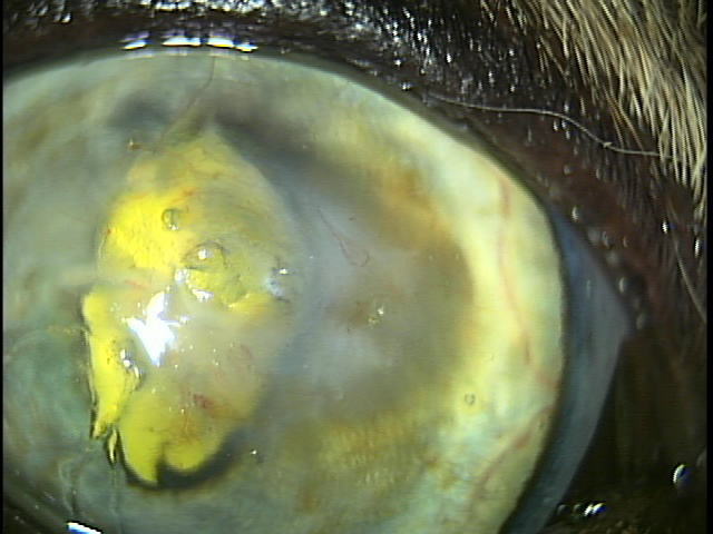 非常に重度の角膜障害を持ち、前眼房水の流出が認められる。無知の獣医による虐待と同様の仕業である。