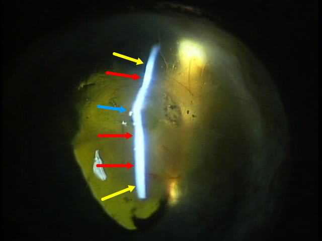 スリットライト所見。黄色の矢印は、眼球のカーブに沿ったもの。赤色の矢印は、眼球中央部分なのに真っ直ぐ。青色の矢印は、飛び出している。青色矢印部分が、最も弱い部分である。