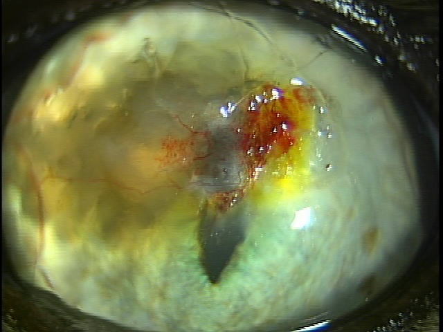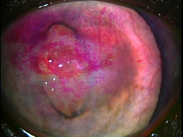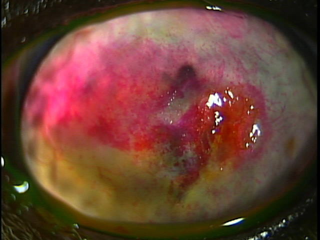 角膜はボロボロに変性を起こし、ふわふわと浮いている様に見える。眼球中央部分の殆ど全てに障害が及んでいる。