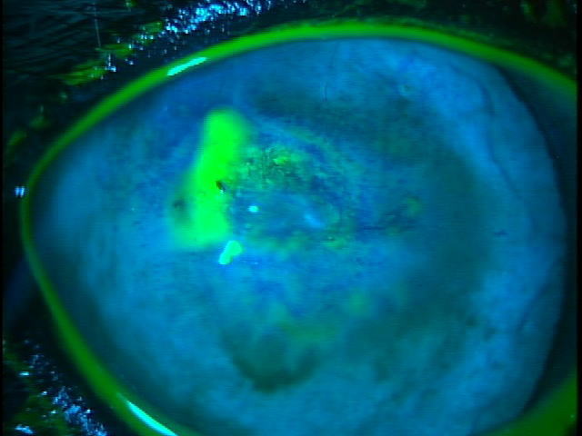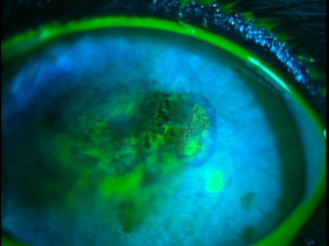 緑色に光っている部分は、角膜上皮の障害を持つ部分である。