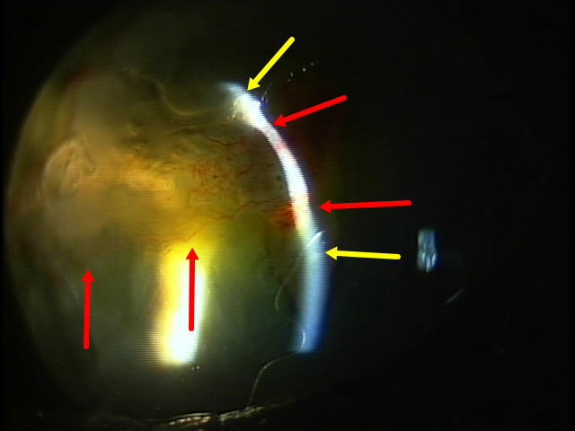黄色の矢印は、正常と思われる部分の角膜。赤色矢印は、変性している角膜であり光も幅が狭い。角膜が融解、薄くなっている。眼球中央部分の殆どを占拠している。